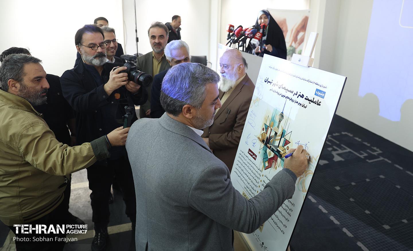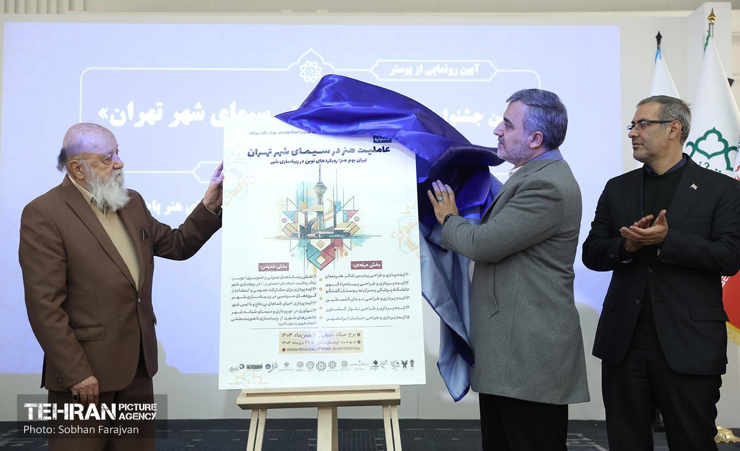آیین رونمایی از پوستر جشنواره «عاملیت هنر در سیمای شهر تهران» ۳ دی ۱۴۰۴ آیین رونمایی از پوستر اولین جشنواره «عاملیت هنر در سیمای شهر تهران» با حضور مهدی چمران، رییس شورای اسلامی شهر تهران، داود گودرزی، معاون خدمات شهری و محیطزیست شهرداری تهران، سیدمرتضی روحانی، شهردار منطقه 6، حامد مظاهریان، رئیس دانشکدگان هنرهای زیبا دانشگاه تهران، صبح روز چهارشنبه 3 دیماه در نگارخانه تهران برگزار شد سبحان فرج ون https://www.tehranpicture.ir/u/nYy مهدی چمران داود گودرزی سید مرتضی روحانی حامد مظاهریان دانشکدگان هنرهای زیبا دانشگاه تهران پوستر